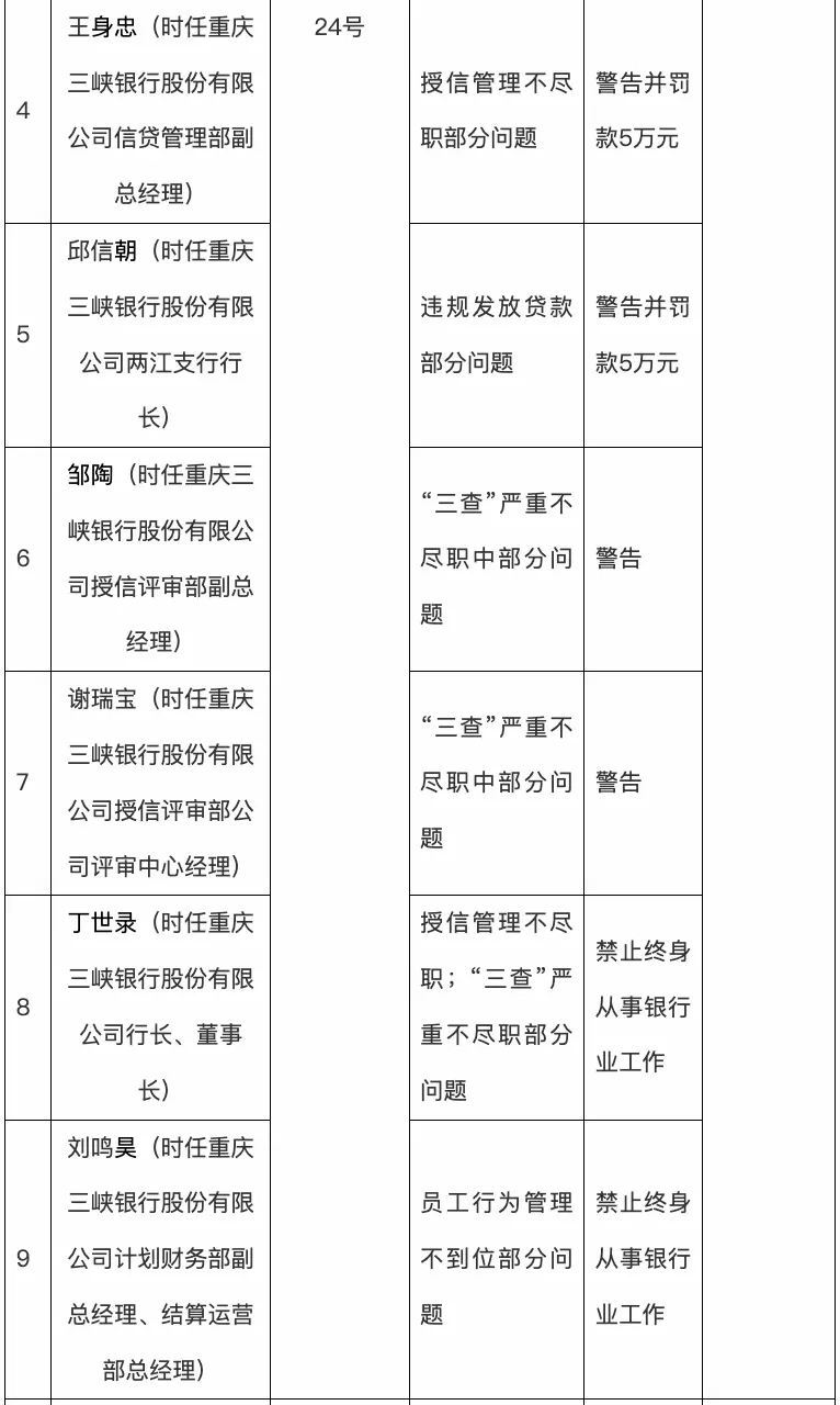 时任重庆三峡银行信贷管理部副总经理王身忠因授信管理不尽职部分问题,受到警告并被罚款5万元;时任重庆三峡银行两江支行行长邱信朝因违规发放贷款部分问题,受到警告并被罚款5万元;时任重庆三峡银行授信评审部副总经理邹陶因“三查”严重不尽职中部分问题,受到警告。时任重庆三峡银行授信评审部公司评审中心经理谢瑞宝因“三查”严重不尽职中部分问题,受到警告。