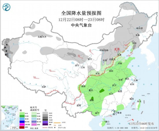 12月22日08时至23日08时,新疆西南部和沿天山地区、内蒙古西南部和中东部、东北地区、甘肃河西、青海北部、陕西中部、华北等地部分地区有小到中雪或雨夹雪,其中,新疆南疆西部山区局地大到暴雪(10~18毫米)。陕西南部、黄淮、江淮、江汉、湖南中北部、西南地区东部、广西中西部、广东东南部、海南岛东部、台湾岛东部等地部分地区有小雨,其中,湖南西北部、贵州中部局地有中雨。内蒙古西部、辽宁西部和辽东半岛、青海南部、甘肃河西、西藏中北部等地部分地区有4~6级风;东海西南部海域、台湾海峡、台湾以东洋面、巴士海峡、南海北部和中部海域将有7~8级、阵风9~10级的大风。