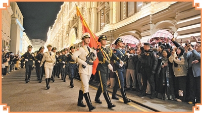 5月3日,中国人民解放军三军仪仗队在莫斯科参加纪念苏联伟大卫国战争胜利80周年