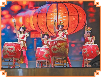 青年表演中国鼓乐。