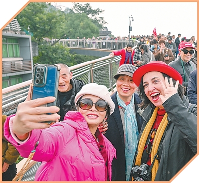 外国游客在重庆半山崖线鹅岭栈桥与市民合影。 |