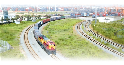 满载集装箱的班列驶离广西钦州铁路集装箱中心站。 |