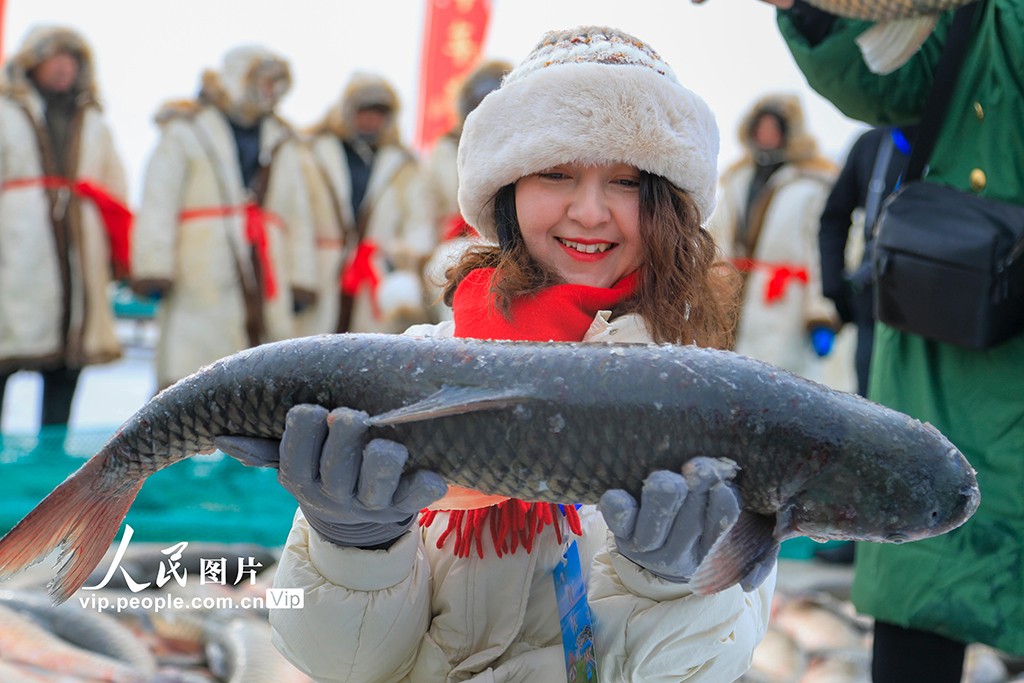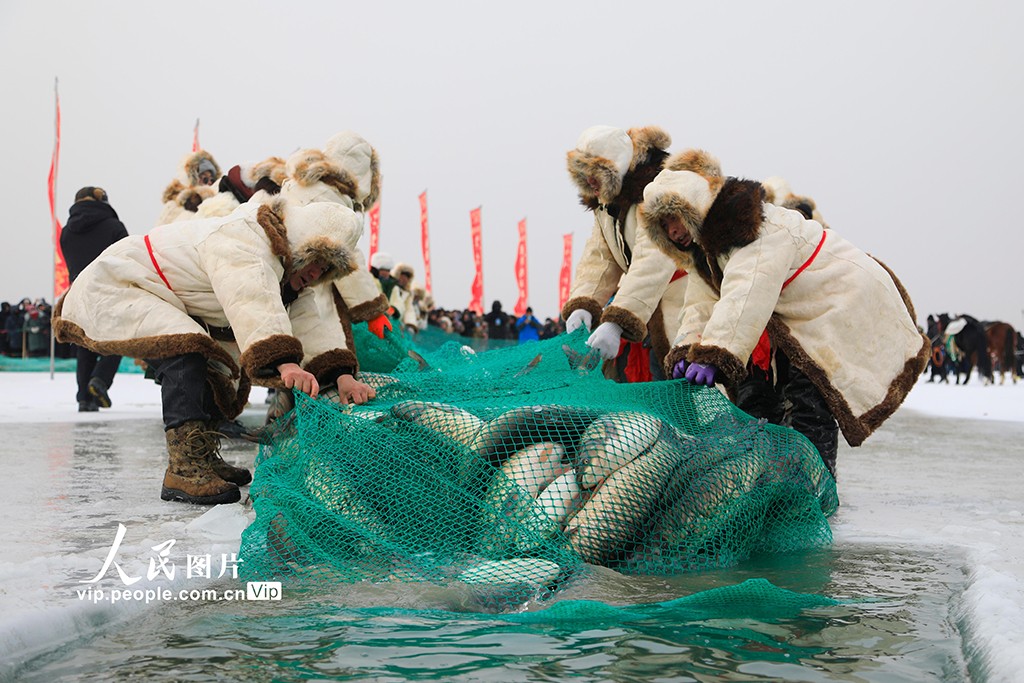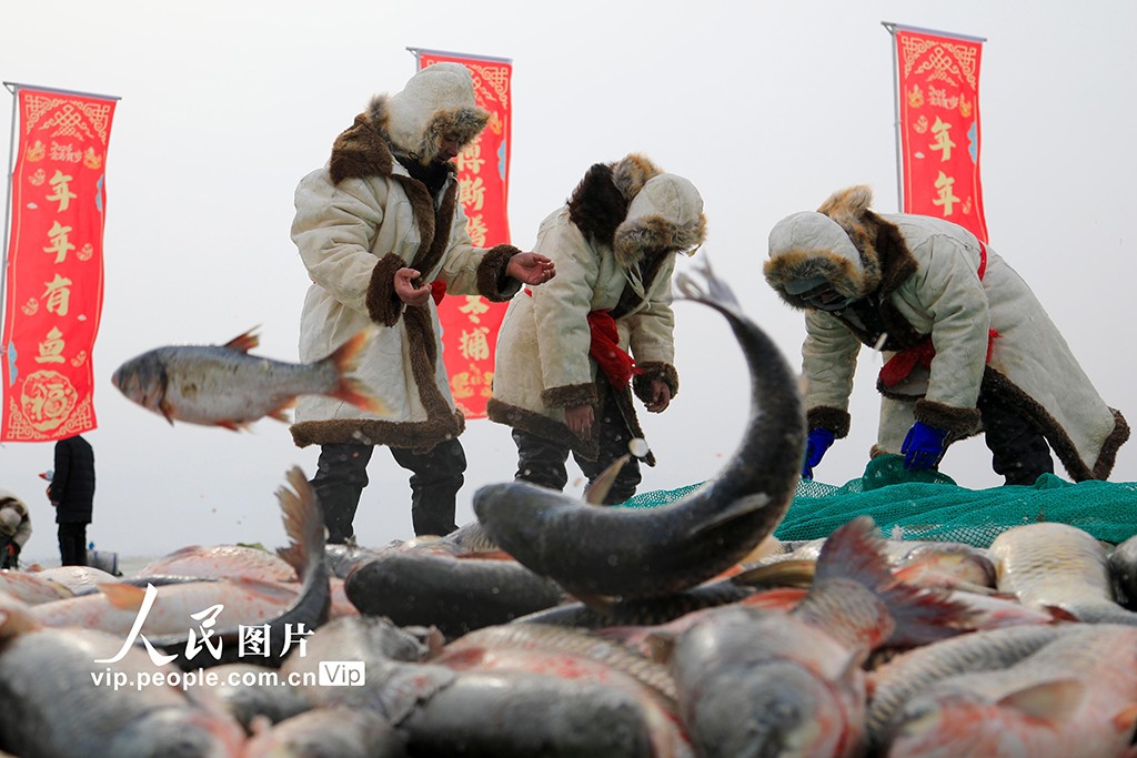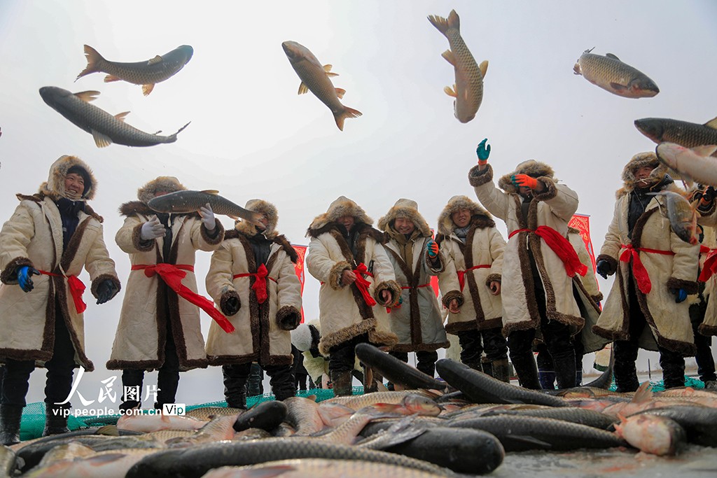 随着高亢的起网号子响起,渔民合力收网,巨网从冰洞缓缓而出。霎时间,鲤鱼、鲢鱼、草鱼破冰而出,在冰面跳跃翻腾,呈现“冰湖腾鱼”的壮观景象。年磊摄(人民图片网)