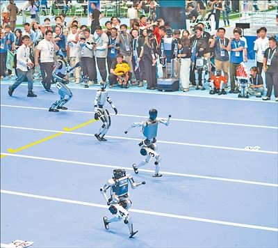 图为机器人在开幕式上开展100米赛跑。